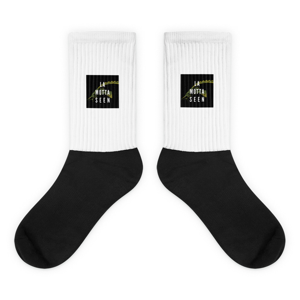 Diese Socken sind dank ihres gepolsterten Bodens besonders bequem. Der Fuß ist schwarz. Der Druck ist entlang des Beins mit klaren, kräftigen Farben, die nicht verblassen.